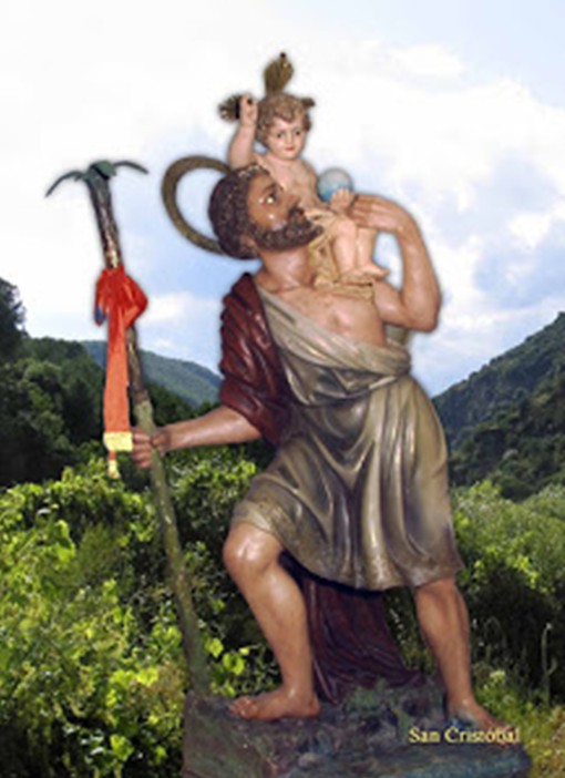 El culto a San Cristóbal de Licia es de origen oriental, llegando a Occidente después del siglo V, de Constantinopla pasó a Sicilia y de allí a Europa Occidental. Su nombre viene del griego “Christophoros” que significa “portador de Cristo”; resumen de la leyenda donde el santo ayudó a un niño a cruzar un río, con gran esfuerzo, pues dicho infante era Jesuscrito que buscaba que San Cristóbal lo sirviera. Es patrón de todo tipo de viajeros y conductores y uno de los “catorce santos auxiliadores”.